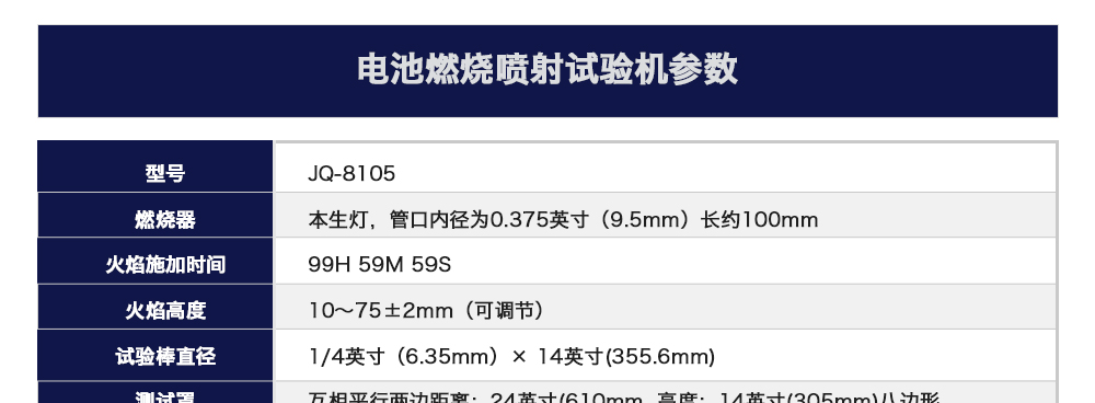 產(chǎn)品型號:JQ-8105 品牌:劍 喬 用途:燃燒噴射試驗機用于汽車用途動力鋰原電池和其它原電池、以及鋰離子電池、鎳氫、鎳鎘以及磷酸鐵鋰電池或者動力鋰電池模塊的外殼材料顆粒燃燒或電池咨詢熱線:13829135130