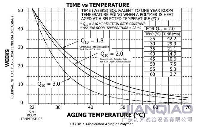大家仔細分析上述兩個公式可以發現,決定加速老化時間的關鍵因素是加速老化溫度,根據ASTM F1980-16附錄X1.1,能夠明確無菌屏障系統在選定溫度下的熱老化相當于1年的室溫老化的時間。例如,若確定Q10為2,加速老化溫度選用50℃,則加速老化時間為7.5周。特別要注意的是,大多數醫用聚合物建議的溫度上限是60℃。